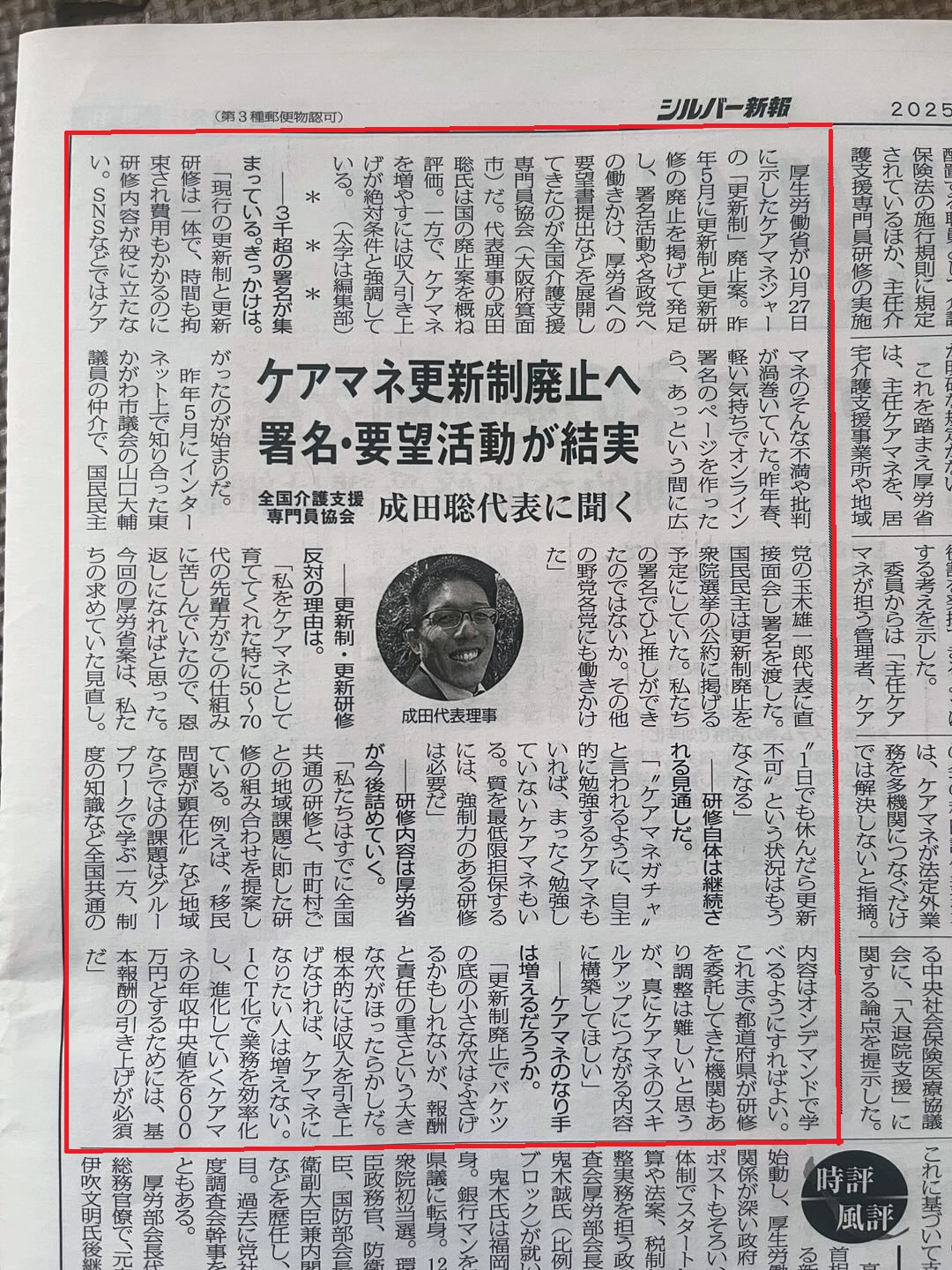 R7年11月11日号 の シルバー新報に、当会代表 成田のインタビュー記事が掲載されました。