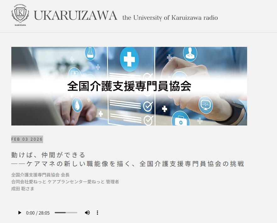軽井沢ラジオ大学に出演しました 2026年2月16日 最終更新日時 : 2026年2月16日 znkk R8年2月3日、軽井沢ラジオ大学に、当会代表 成田が出演しました。 バックナンバーは、コチラです。 このページをシェアする